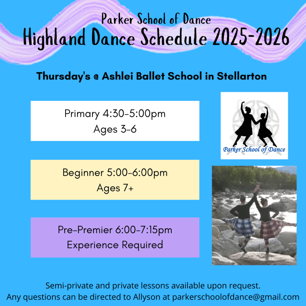 2025-2026 registration for highland dance classes offered through Parker School of Dance are now open. If you have any questions, please email Allyson at parkerschoolofdance@gmail.com.